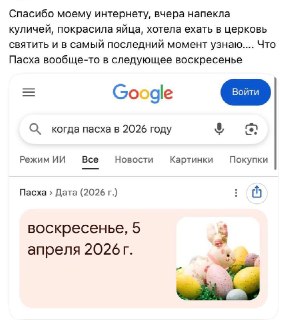 😅 Россияне массово перепутали дату Пасхи из-за VPN и уже успели отметить праздник При включённом VPN поисковики показывают дату католической Пасхи —...