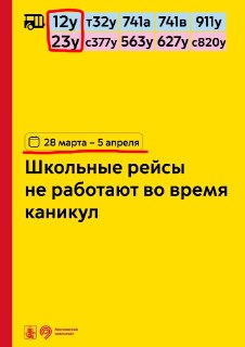 🚌 С 28 марта по 5 апреля школьные рейсы не будут работать. У нас это 12у, 23у.