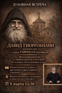 Во время встречи Давид Гиоргобиани поделится живым свидетельством о жизни и подвиге старца Гавриила, о его любви, юродстве и глубине веры. Это будет рассказ человека, лично знавшего старца и воспитанного в его духовной традиции.